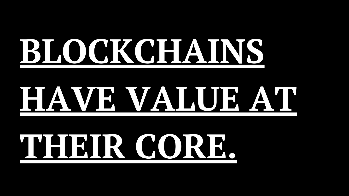 Blockchains have value at their core. They are money networks, and as such, they make for more efficient financial systems. They cut out intermediaries, improving speed and cost. They are permissionless and global, so that essential tools to grow savings and make payments and transfers, are at the hands of anyone with an internet connection, anywhere in the world.