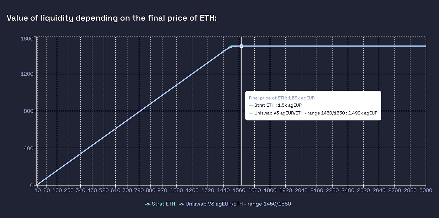 Another cool feature of Uni V3 is that by adding multiple LP positions, or choosing your range carefully, you can reproduce any type of market. Let’s do just one example: starting at 1 ETH = 1000 agEUR, this is what you’ll get when providing liquidity on the range 1450–1550 versus going all in ETH and taking profits at 1500.