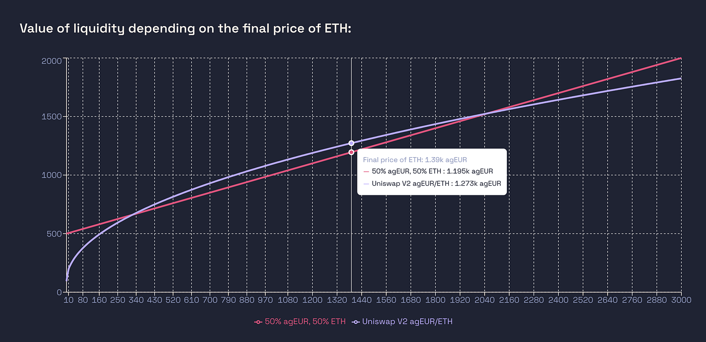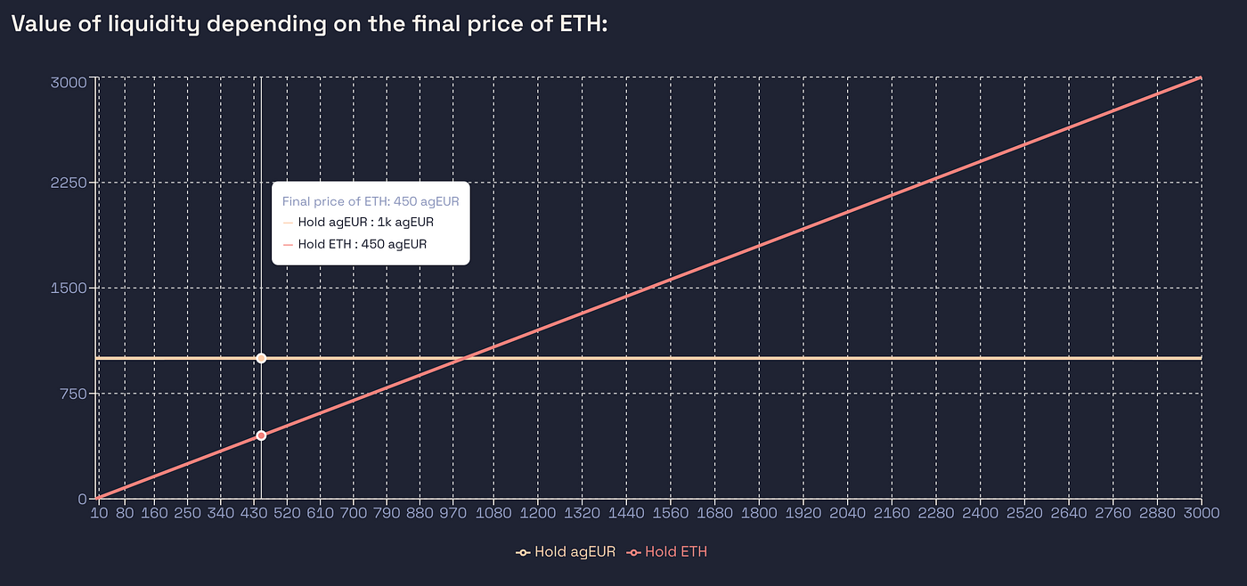 It may seem complex, but this graph basically says that you’ll have 1000€ if you’ve held agEUR or whatever 1 ETH will be worth a year from now if you’ve held ETH.