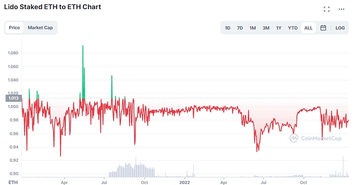 Secondly, the token you received in return for depositing, such as stETH, will not necessarily maintain its monetary value as you cannot currently withdraw it back into ETH and will need to trade it on the secondary market in order to convert it. In fact, stETH has consistently traded below peg since launch, so traders that have to exit quickly usually would face a small loss in terms of ETH.