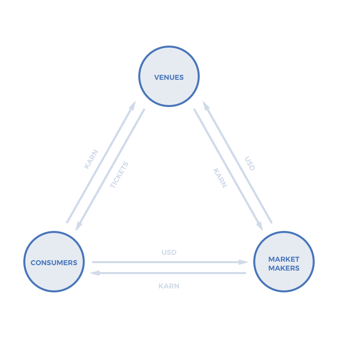 Venues also don’t have an incentive to hold Karn tokens because they, too, want to avoid price risk. After consumers trade their tokens for concert tickets, venue hosts will trade Karn tokens for their preferred currency. Note that this cycle can be completed in seconds by leveraging decentralized exchanges such as 0x: