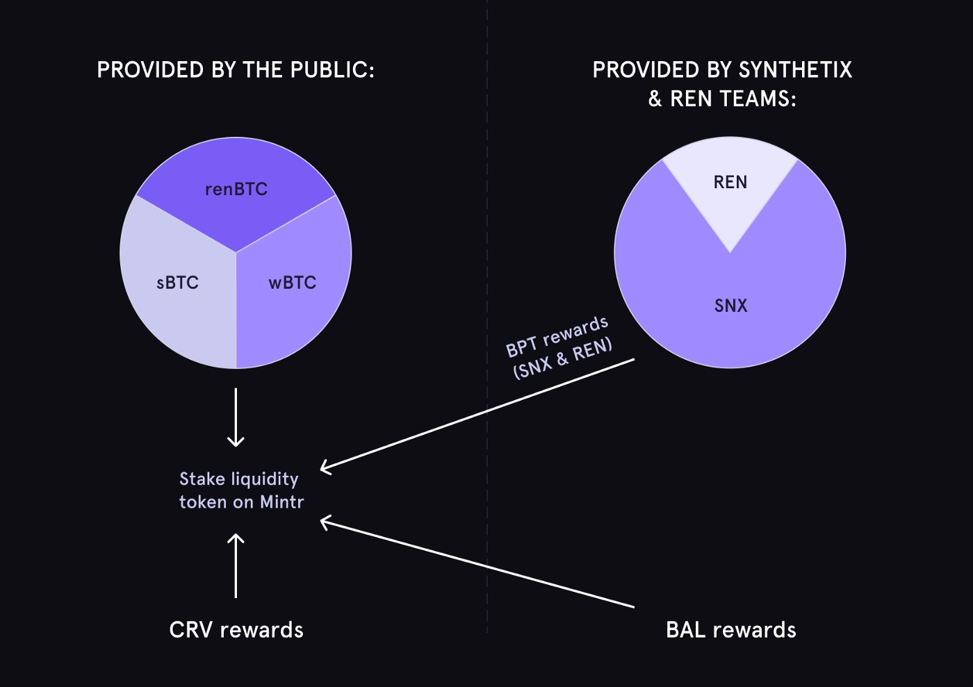 Because of the unique way the system has been set up, participants who provide WBTC, renBTC, and sBTC liquidity to the new BTC Curve liquidity pool will simultaneously earn BAL, SNX, REN, and CRV (Curve’s coming reward token). That’s a yield farmer’s dream come true, but how’s it possible? First off, the Synthetix and Ren teams have created a Balancer pool composed of SNX and REN tokens. This pool will generate BAL from Balancer’s liquidity mining campaign, as well as liquidity provider (LP) rewards in the form of BPT, which is simply a wrapped combination of SNX and REN.