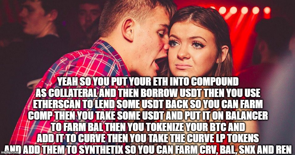 Yield farming has exploded onto the DeFi scene and captured peoples’ imaginations, and the fervor at hand makes it easy to envision this exciting meme going on to attract people to Ethereum for years to come. But remember: it’s not all fun and games, either. As Ethereum stalwart Eric Conner recently put it, yield farming does have liquidation risks and smart contract risks, and as such you should never farm with money you’re not willing to lose while things are still early.