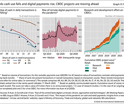 Yet further-reaching changes to the existing monetary system are burgeoning. Demands on retail payments are changing, with fewer cash transactions and a shift towards digital payments, in particular since the start of the Covid-19 pandemic (Graph III 1, left-hand and centre panels). In addition to incremental improvements, many central banks are actively engaged in work on CBDCs as an advanced representation of central bank money for the digital economy. CBDCs may give further impetus to innovations that promote the efficiency, convenience and safety of the payment system. While CBDC projects and pilots have been under way since 2014, efforts have recently shifted into higher gear (Graph III.1, right-hand panel).