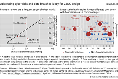 Any identification framework requires a high standard of cyber security. PSPs have been frequently targeted by cyber attacks, both before and during the Covid-19 pandemic (Graph III.10, left-hand panel). The rising incidence of major data breaches in recent years, in particular at financial institutions (right-hand panel), underscores the possibility that data or funds may be stolen. Such risks would be similar for CBDC payment services.