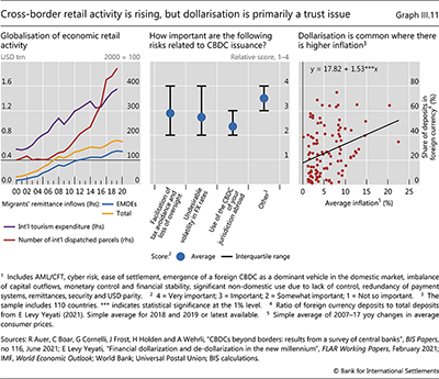 For these reasons, the risks of currency substitution from cross-border use of CBDCs may be limited and could be addressed largely through international monetary cooperation. The widespread international use of some currencies stems from other factors, such as the depth, efficiency and openness of a country's financial markets, trust in a currency's long-run value and confidence in the institutional and legal infrastructure. For instance, dollarisation is typically higher in countries with historically high inflation (Graph III.11, right-hand panel). A foreign currency is unlikely to gain a domestic foothold just because it is digital.