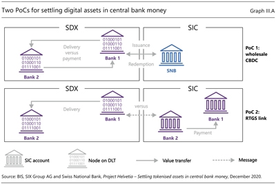 State-of-the-art approaches in this domain are exemplified by Project Helvetia – a joint experiment by the BIS Innovation Hub Swiss Centre, SIX Group AG and the Swiss National Bank. This project demonstrates the feasibility of settling digital assets in central bank money. Two proofs-of-concept (PoCs) were compared: (i) issuing a novel wholesale CBDC (Graph III.A, top panel) and (ii) building a link between the new SIX Digital Exchange (SDX) platform and the existing RTGS central bank payment system, Swiss Interbank Clearing (SIC) (bottom panel). Both PoCs were found to be functionally feasible, and transfers were shown to be legally robust and final. Each PoC presents different practical and operational benefits and challenges.