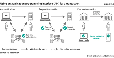 The analogy with the payment system is that the market stallholders in the public town square are like PSPs, each offering basic payment functionality with their particular bundle of services, such as banking, e-commerce, messaging and social media. Just as the market stallholders must stick to the standards laid down by the town authorities, these PSPs must adhere to various technical standards and data access requirements. These include technical standards such as application programming interfaces (APIs) that impose a common format for data exchange from service providers (see Box III.B). Together with data governance frameworks that assign ownership of data to users, these standards ensure interoperability of the services between PSPs so that they can work seamlessly for the user. Two instances of APIs are account information services (AIS) and payment initiation services (PIS). AIS allow users to "port" data on their transactions from one provider to another. For instance, a user who has accounts with two different banks can open the app of one bank to check the balances in the other. PIS allow a user to operate the app of one PSP to make an outgoing payment from the account of another.