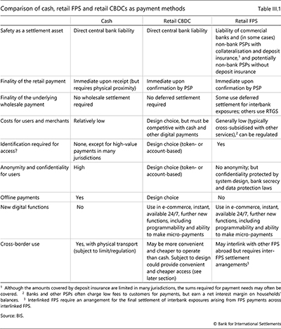 Whether retail CBDCs will play a similarly beneficial role will depend on the way that CBDCs frame the interaction between PSPs and their ancillary services. In a general sense, the public good nature of both CBDCs and retail FPS can be seen as resting on an open payment system around the interoperability of the services offered by PSPs. Table III.1 compares cash, retail CBDCs and FPS along dimensions relevant for users and public policy. Several similarities, but also differences, emerge.