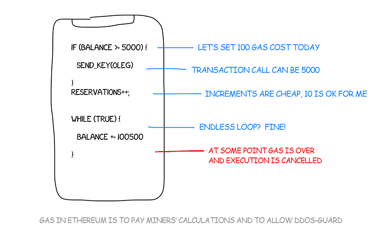 Each operation inside the virtual machine has its own “price”, which is as simple as this: it costs 1 cent to execute 1 line. To execute 15 lines, you need to put 15 cents into the transaction call. It is not necessary to remember the prices when creating a smart contract. The author automatically considers everything.