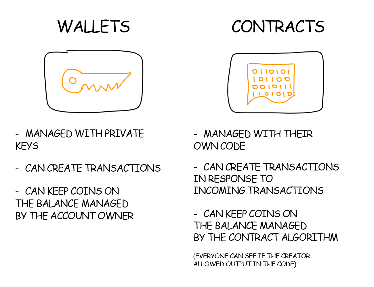 A traditional user wallet here is called “externally owned account” and created “contract account” in the network of smart contracts. In the following text, they’re called “wallet” and “contract”, for brevity.