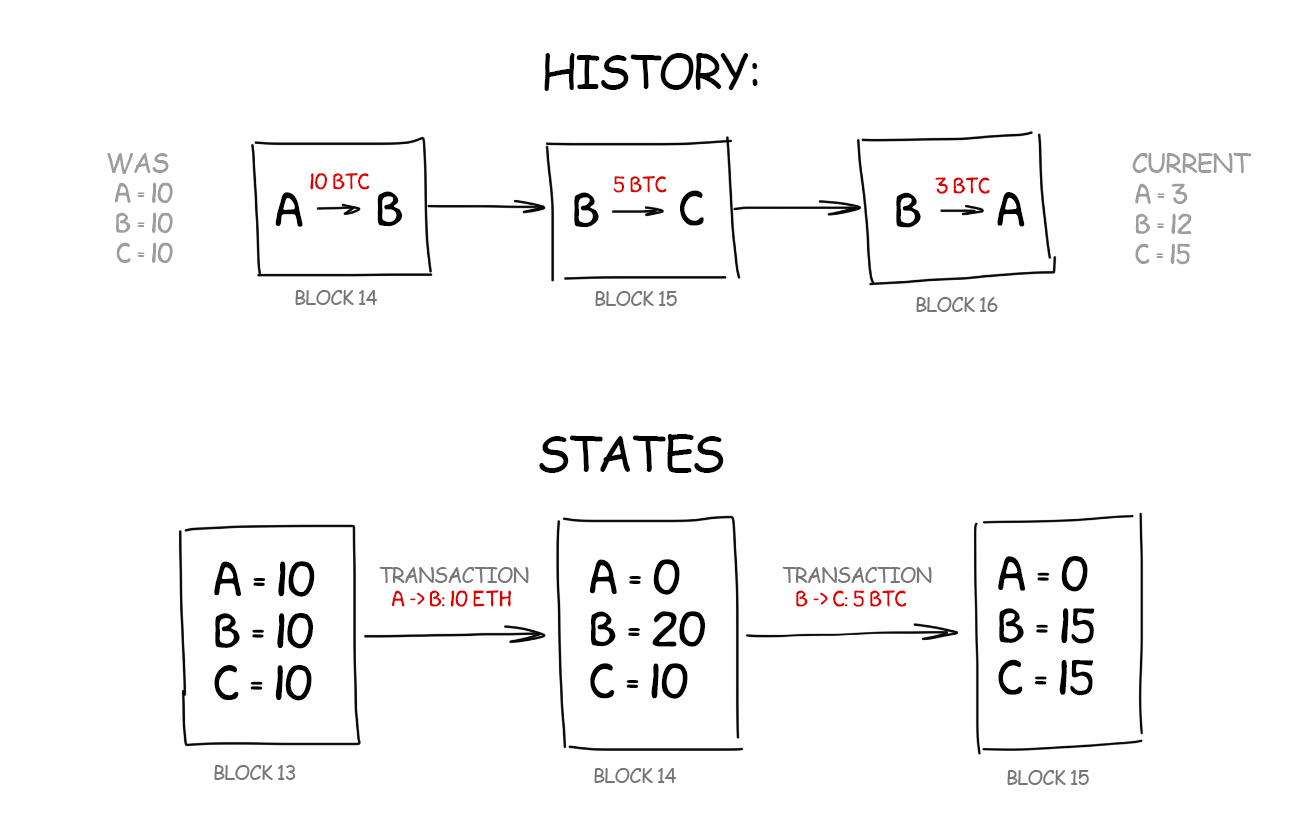 In my previous post, I told in simple words that blockchain consists of a long chain of all changes – its history. To calculate the current balance of the wallet you need to go through it and put everything down. I received 5 BTC, paid 3 BTC, then received another 4 BTC, total balance is 5 – 3 + 4 = 6 BTC – this was the current state of the wallet.