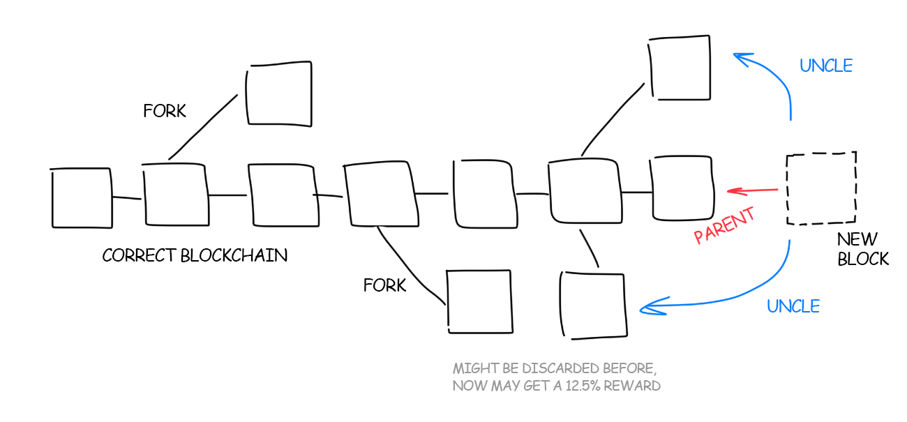 When building a new block, miners include not only a reference to its parent but also a list of references to blocks whose parent is equal to the parent of the parent of the current block. They are called “uncles”.
