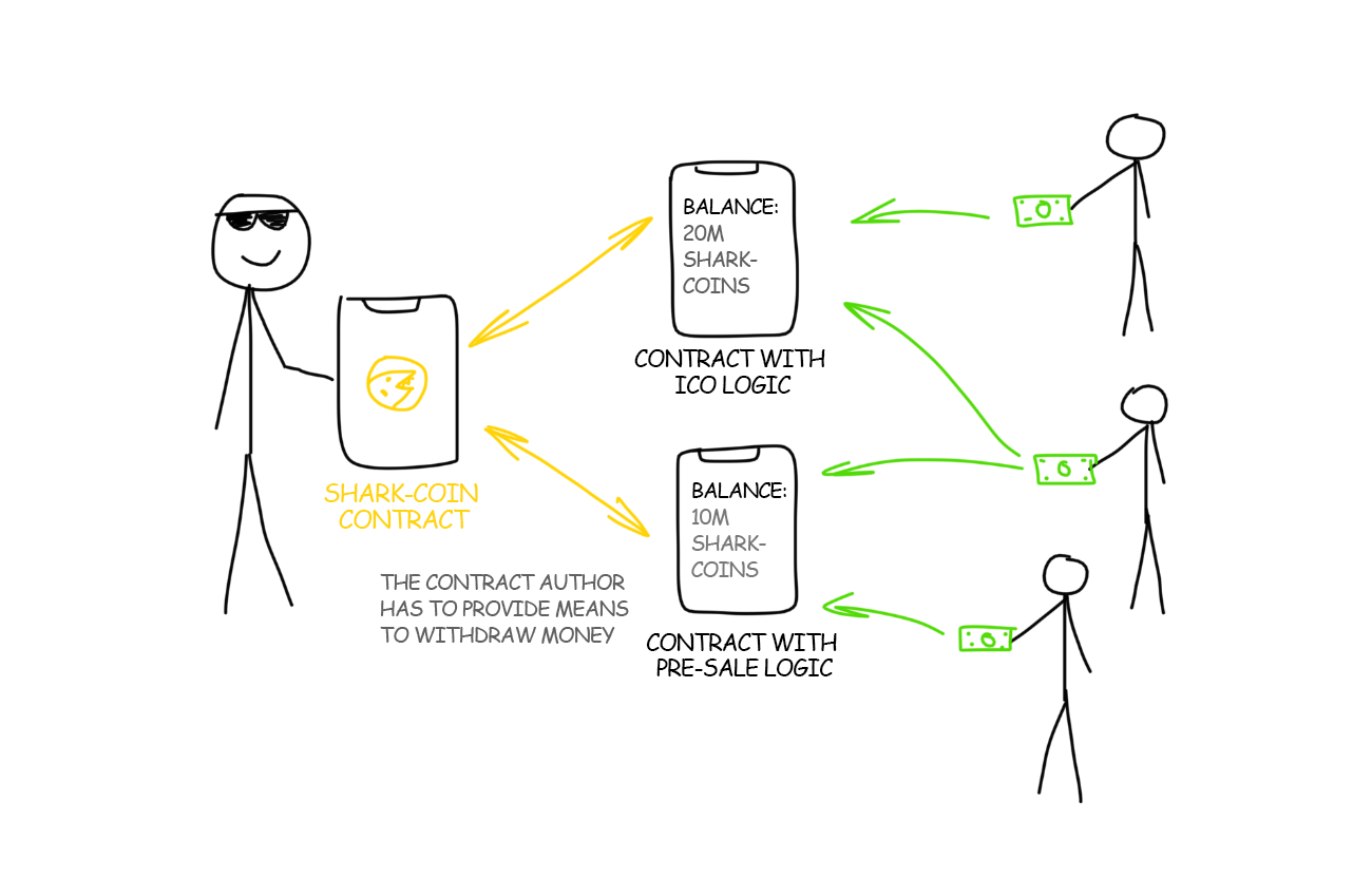 For a full-fledged ICO, the logic of the sale itself is missing: how much is a token, what is the sales limit, whether there are discounts to early buyers and other features. Alex can lay the whole logic right in the shark-coin but then it couldn’t be changed either set new limits nor arrange a sale.