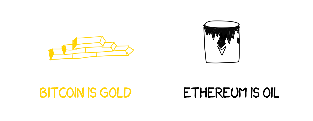There is a popular analogy: “Bitcoins is Gold, Ethereum is Oil”.