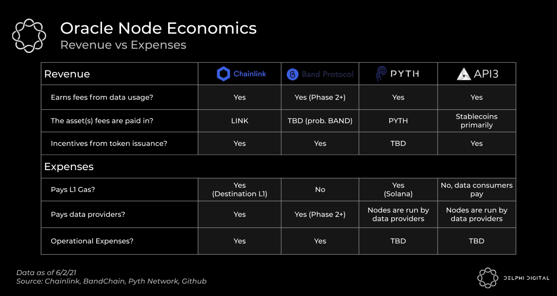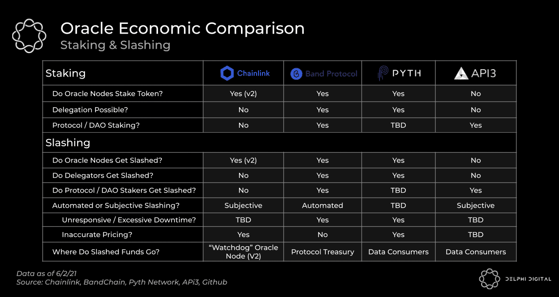 Staking, in one form or another, is likely necessary though, if for no other reason than to align incentives and make the oracle solution more sybil-resistant. Will the staked value be enough to truly secure the data feeds? After much debate between members of our team, we’re not sure if attaining that is feasible, or even economically viable. In the absence of it, we believe that reputation will be vital to security, perhaps moreso for oracles than any other sector in crypto. With this in mind, one aspect we like about Pyth and API3 is that the data providers themselves are the ones placing their reputation on the line. If prominent firms participate, it will go a long way to improving the trust consumers place in their oracles relative to the third-party operators seen in Chainlink and Band Protocol. Furthermore, the fact that the majority of Chainlink nodes are completely anonymous is less than ideal. However, Chainlink’s DECO and Town Crier solutions, as outlined in the V2 whitepaper, could allow third-party node operators to prove that they haven’t tampered with the data they received from its source.