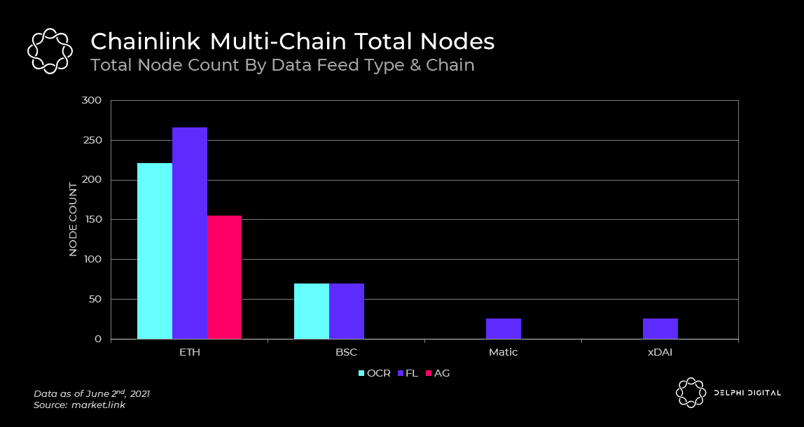 Chainlink is often touted as having hundreds of oracle nodes. While certainly true, only a small subset of the total nodes support each individual data feed and chain. For example, if we look at the chart below, the average number of nodes ranges from 9-12 depending on the chain. The implications of this will be important to consider when we reach the staking section later on in this report.