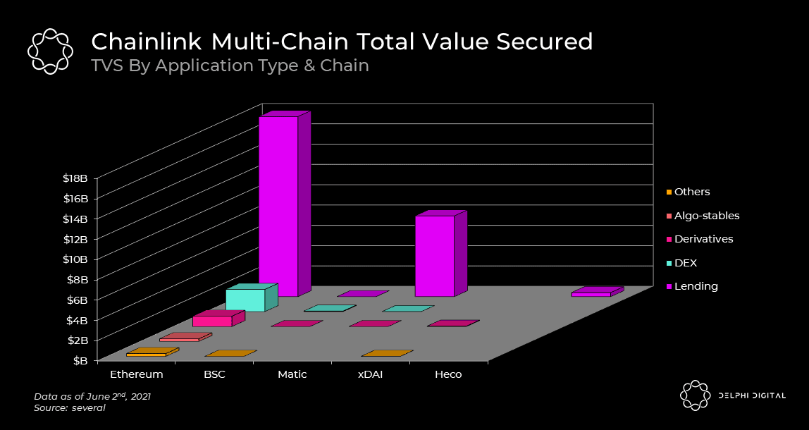 The hardest part about building an oracle protocol is the security. Namely, how do you create a decentralized, economically secure solution that is resistant to price manipulation? Lending protocols rely on its price feeds to determine whether or not a borrower needs to go into liquidation. Derivative protocols rely on its price feeds to ensure positions and payouts are marked accordingly. To understand the scale of the problem, let’s take a look at the amount of value reliant on these data feeds. In the chart below, we’ve broken out the total value secured by Chainlink across different application types and chains. In total, Chainlink secures ~$30b at the moment. With all this money on the line, how do you prevent a small group of anon node operators with nothing on the line from manipulating markets to their benefit?