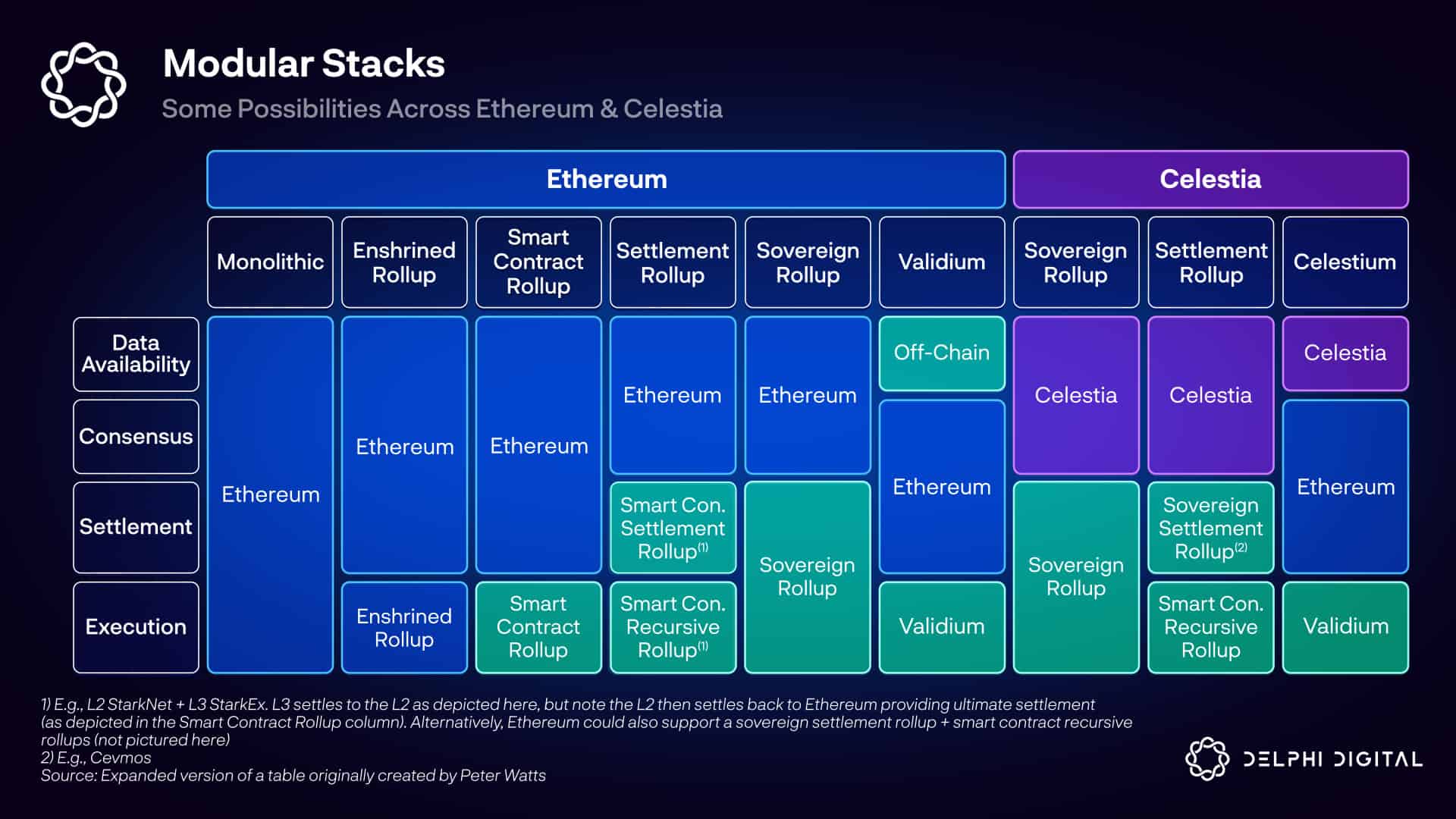 Note possibilities such as Validiums and Celestiums using separate layers for DA and settlement also exist. Any settlement layer could be used so long as it accepts an attestation from Celestia that the data has been made available.