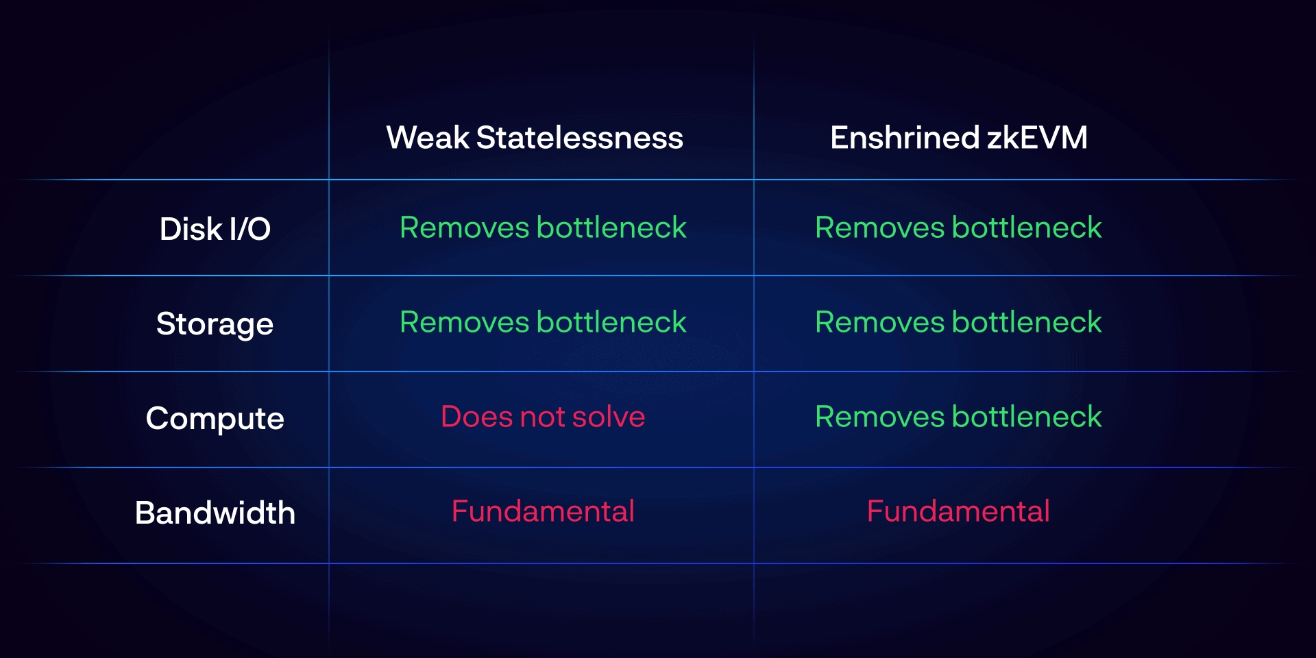 The other argument is that the routine operating costs of a rollup at scale paid to a settlement layer are low anyway. Even SCRs today pay very little to Ethereum’s settlement layer, and this will reduce further with upcoming optimizations. Any other settlement layer would be far cheaper and less constrained (particularly a settlement rollup). These costs will drop further with more efficient proofs and amortization of them over more transactions. Ethereum will also scale its settlement layer (though years down the road) potentially with statelessness, state expiry, and zkEVM.