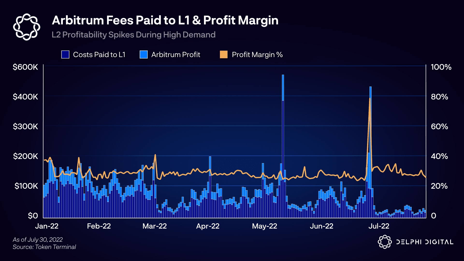 We clearly see this in Arbitrum’s latest spike, though their margin has been quite stable otherwise. The recent bottleneck was L2 execution (not L1 costs), and so their native fee market kicked in: