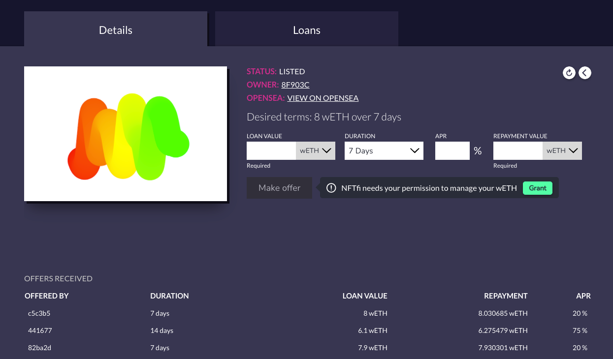 The nice thing about NFT-backed lending is that debt positions can, too, be represented as NFTs which can then be plugged into other financialization protocols. For example, NFTfi promissory notes can be further leveraged or utilized in other hedging strategies.