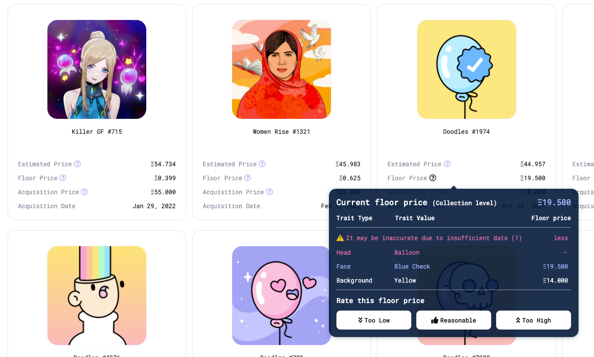 This is a more capital efficient means to price discovery because the fixed cost of developing pricing models is amortized across many assets over time. However, given the relatively low amount of available data on top-tier items (“grails”), this method is likely most useful for liquid items within a collection for the foreseeable future (floors, mid-tier). Data-driven approaches are also less useful for items that are subjectively priced, like 1/1 art, for which crypto-economically incentivized appraisal protocols may be more suitable.