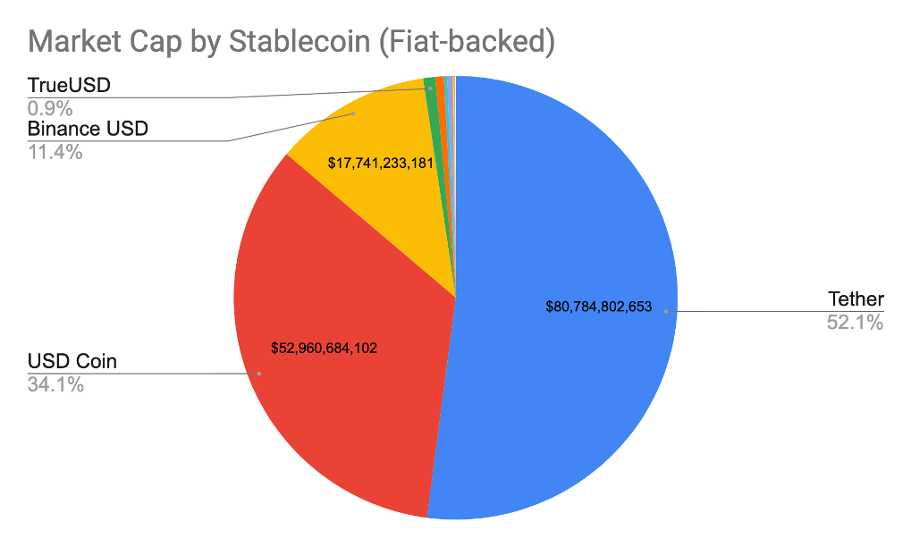 Total market cap of fiat-backed stablecoins currently stands at +$155 billion, account for ~85% of the total stableocin market. Source: CoinMarketCap