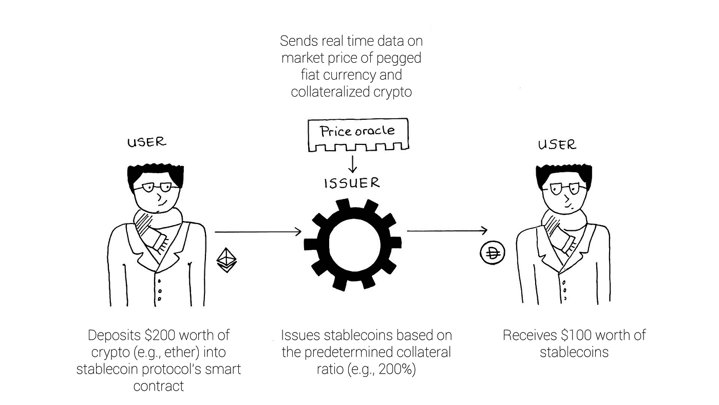 Two different types of stablecoin users: Consumers and DeFi participants (DeFi =decentralized finance). A consumer is someone who simply wants to buy and hold stablecoins. For example, someone who only uses stablecoins to convert their salary into DAI or USDT to save in dollars could be considered a consumer. Consumers usually interact with stablecoins only via secondary markets such as using a fiat-to-crypto exchanges to buy / sell stablecoins. If you identify as a consumer and are not necessarily curious about the systems behind stablecoins, you do not have to worry about the intricacies of stablecoin protocols — feel free to just skim through the sections until Section 5. A DeFi participant, on the other hand, leverages stablecoin protocols to mint (create) stablecoins and participate in various DeFi activities such as yield farming. A range of parties could counted as DeFi participants including but not limited to traders, institutions, crypto exchanges, and DAOs. Understanding how a DeFi participant interacts with a stablecoin protocol is crucial because without them, stablecoins do not exist. If you identify as a DeFi participant or are interested in the nuts and bolts of stablecoins, this section is perhaps relevant and useful for you. Enjoy!