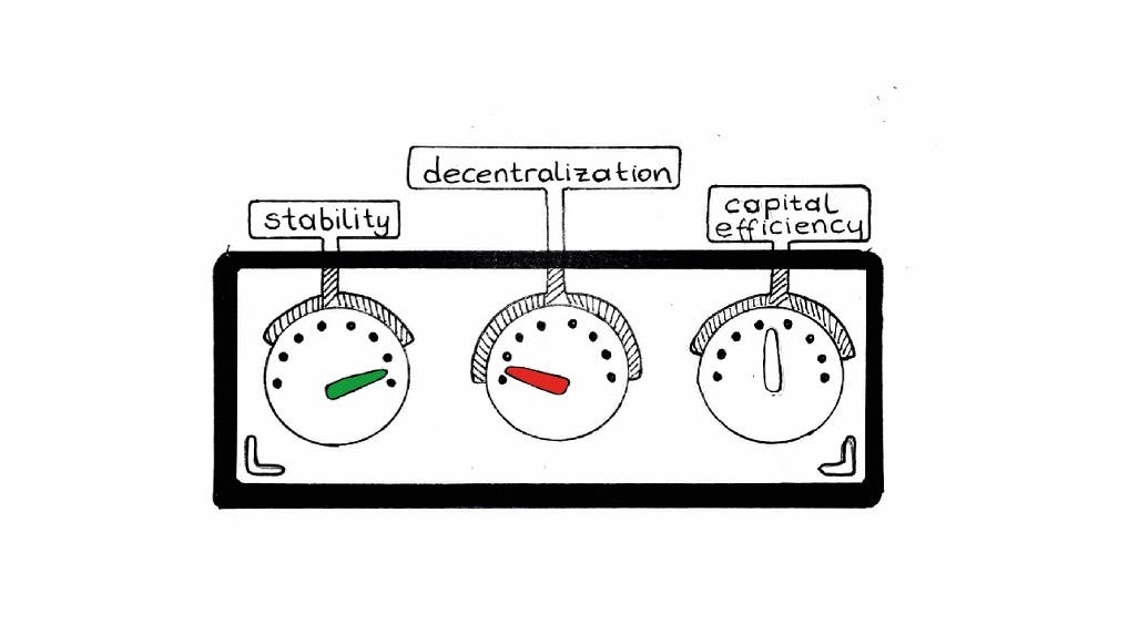 Mission control deck for crypto-backed stablecoins by diedamlas. High stability, high decentralization, low capital efficiency.