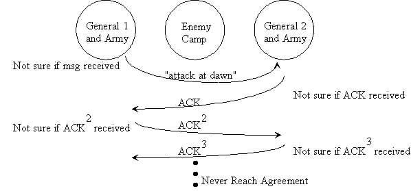 Even if the first message goes through, General 2 has to acknowledge (ACK, notice the similarity to the 3-way handshake of TCP ) that he received the message, so he sends a messenger back, thus repeating the previous scenario where the messenger can get caught. This extends to infinite ACK’s and thus the generals are unable to reach an agreement.