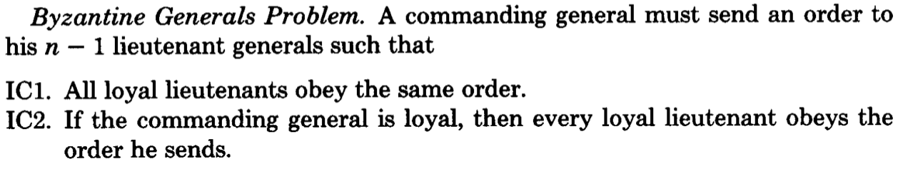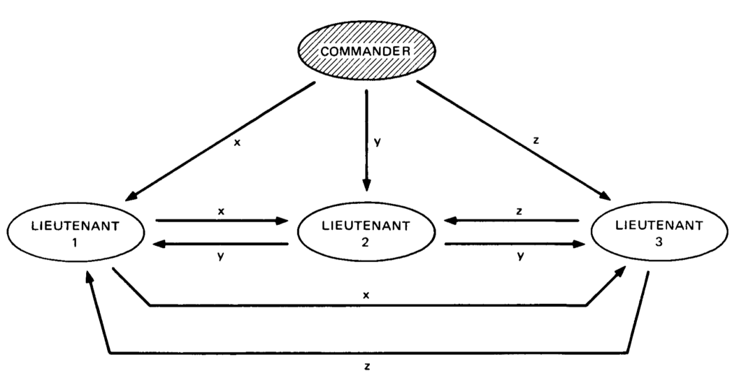 Famously described in 1982 by Lamport, Shostak and Pease, it is a generalized version of the Two Generals Problem with a twist. It describes the same scenario, where instead more than two generals need to agree on a time to attack their common enemy. The added complication here is that one or more of the generals can be a traitor, meaning that they can lie about their choice (e.g. they say that they agree to attack at 0900 but instead they do not).