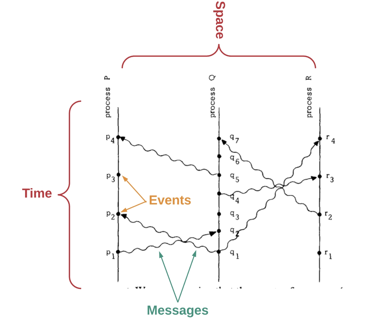 In the paper “Time, Clocks and Ordering of Events in a Distributed System,” Leslie Lamport shows how we can deduce whether one event happens before another by remembering the following factors: