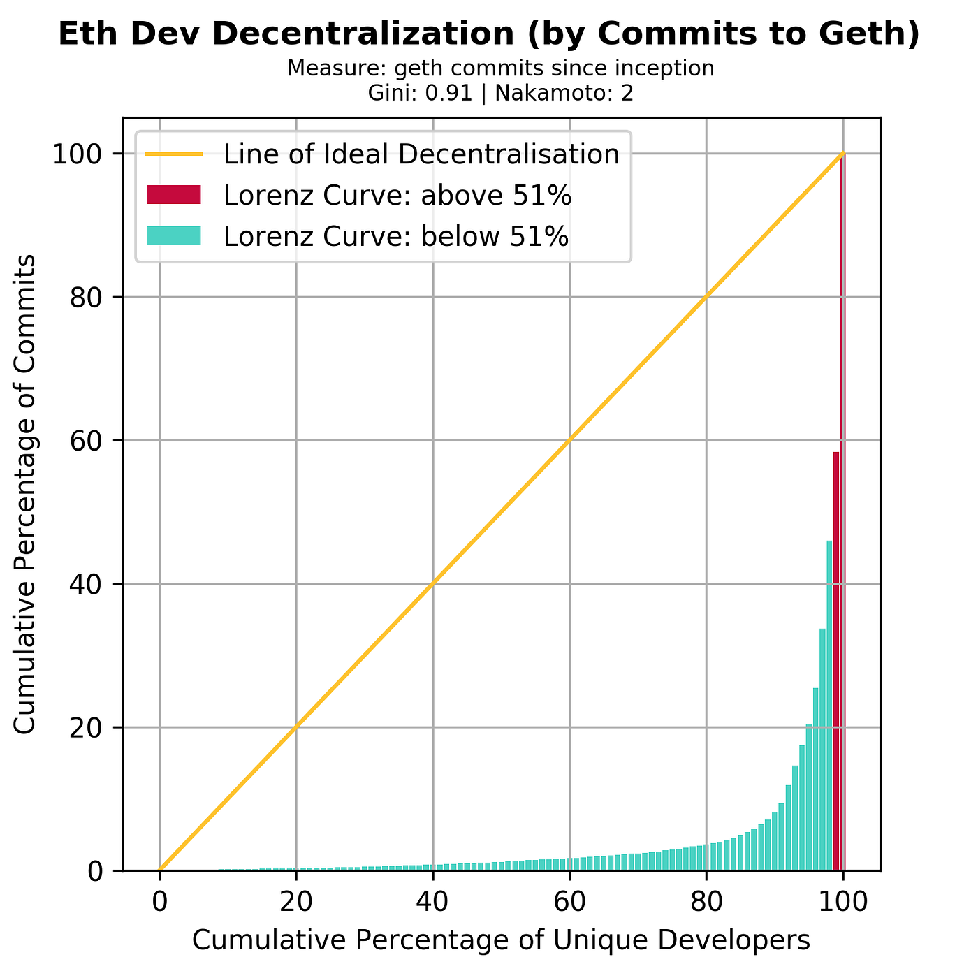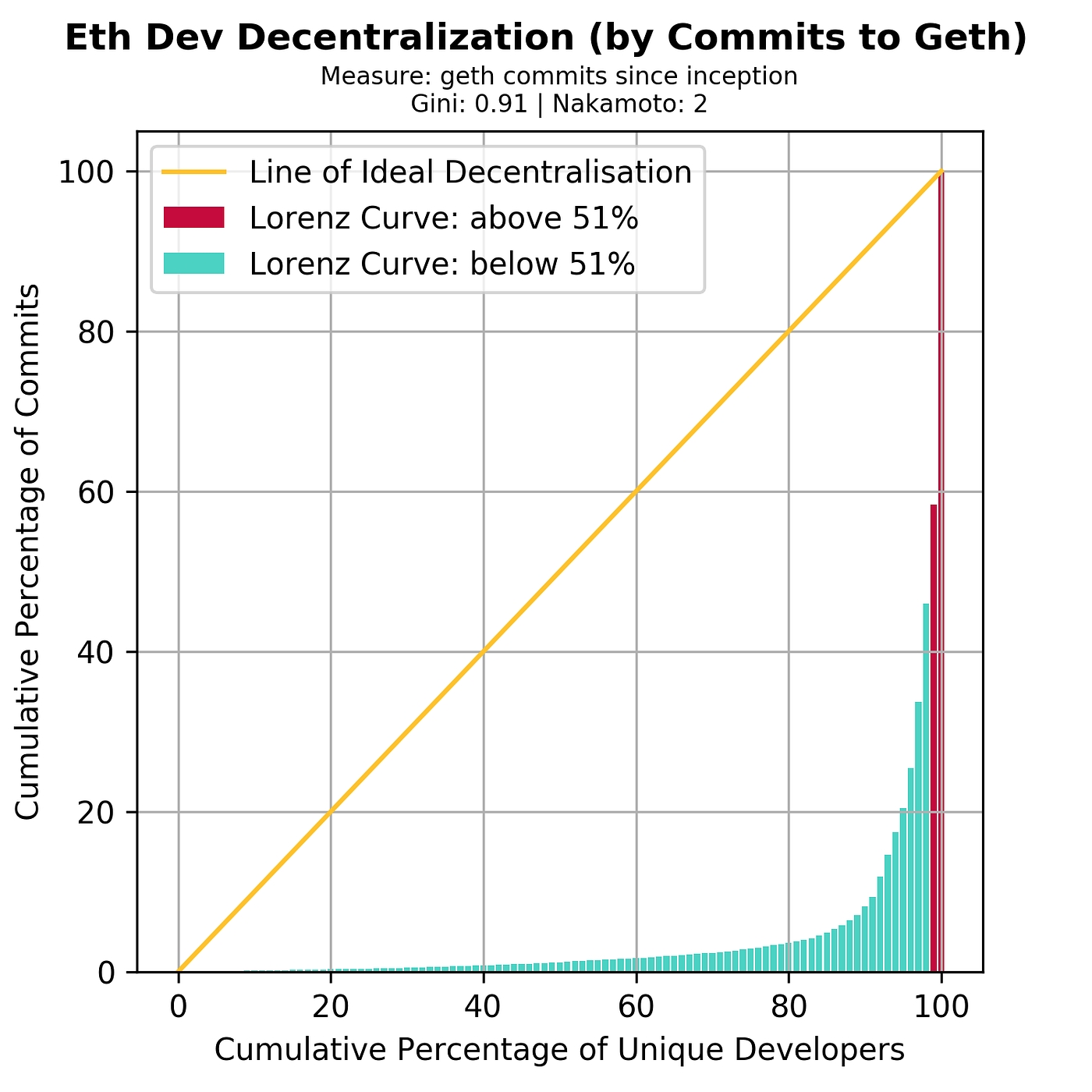 So, by this measure, both Bitcoin and Ethereum have a maximum Gini Coefficient of ~0.92, because both of them have nodes with clients that are very highly concentrated in one codebase (Bitcoin Core for Bitcoin, and geth for Ethereum).