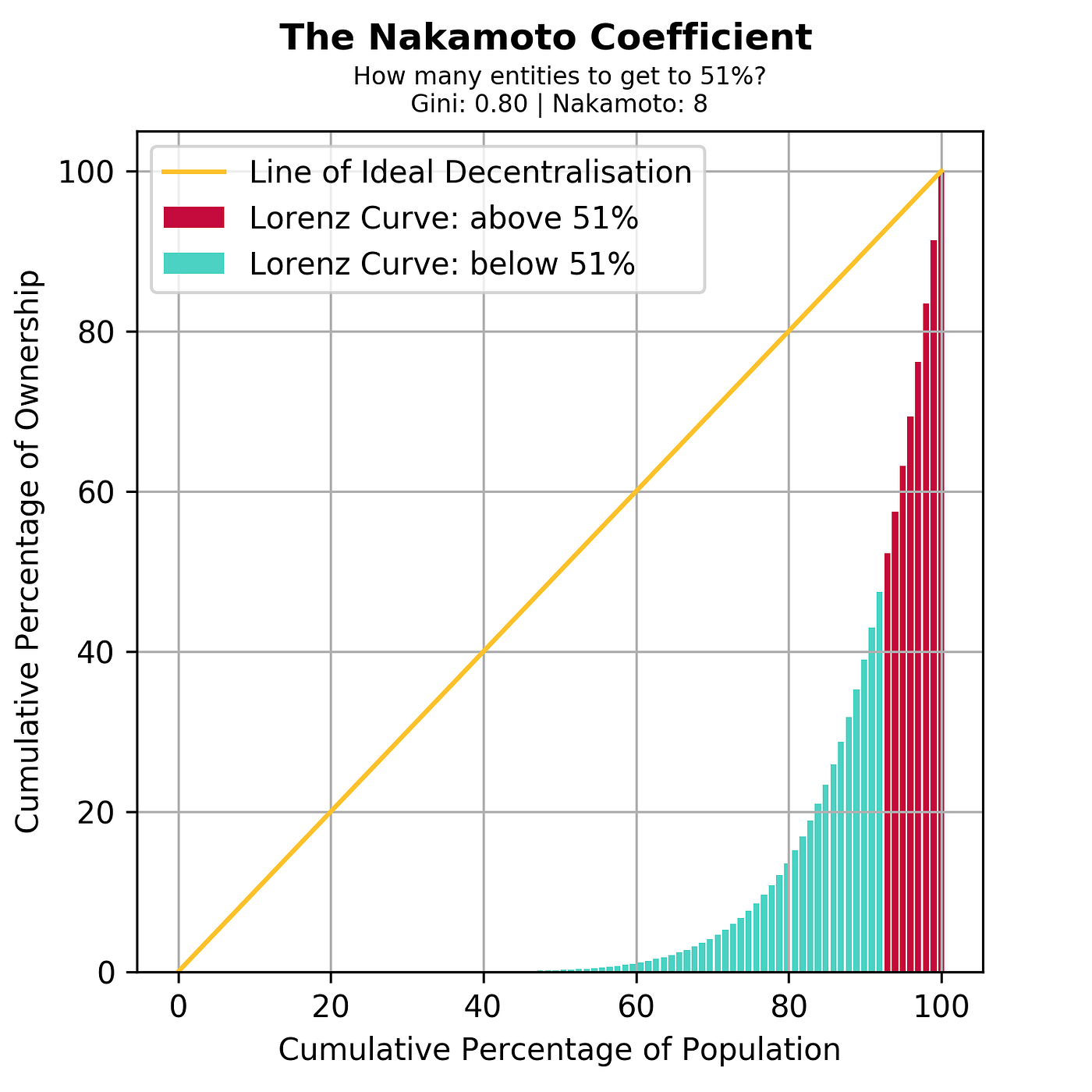 An alternative approach is to define a spiritually similar metric based on the Lorenz curve from which the Gini coefficient is calculated, which we dub the “Nakamoto coefficient”. A visual is below. In this example, the Nakamoto coefficient of the given subsystem is 8, as it would require 8 entities to get to 51% control.