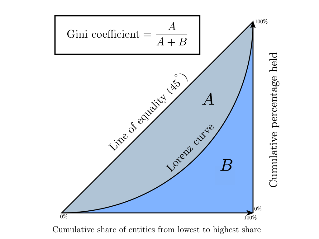 The equation for the Gini coefficient can be calculated from the areas under the Lorenz curve and the so-called “Line of Equality” as shown below: