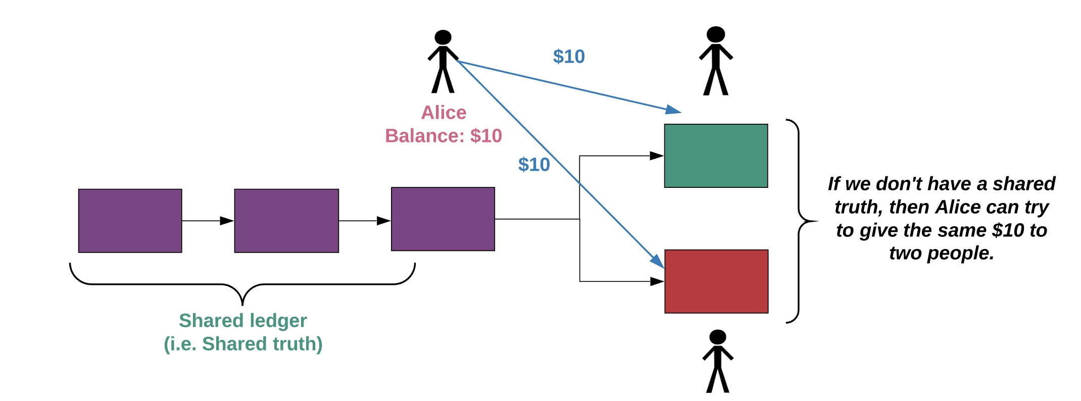 Blockchains have a shared ledger that gives us the absolute truth of the state of the system. It use mathematics, economics, and game theory to incentivize all parties in the system to reach a “consensus”, or coming to an agreement on a single state of this ledger.
