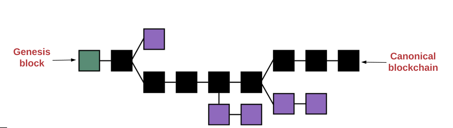 Since miners are competing to run computations, there are times when multiple blocks get solved at the same time. This then creates a “fork” of multiple chains: